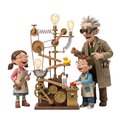 Un laboratorio de experimentación pura donde, a través de la historia de un inventor despistado, niñas y niños dominan las bases de la ciencia, la mecánica, la electrónica tangible y la lógica de programación sin necesidad de pantallas ni lectoescritura fluida.