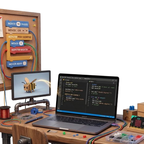 Lo más emocionante de este camino es el encuentro con el código. Por primera vez, los MoscaLabers empiezan a asomarse al mundo del texto (JavaScript y Python), entendiendo cómo se escribe la tecnología que usamos todos los días.
